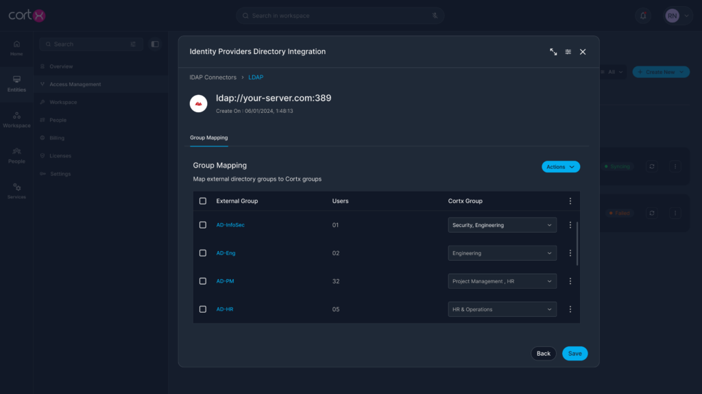 Once saved, all users from the mapped organization groups are imported into the corresponding Cortx User Groups.